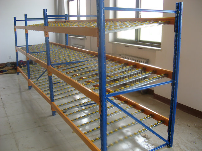 流利式貨架又稱為滾輪式貨架,流利架是將貨物置于滾輪上,利用一邊通道存貨,另一邊通道取貨。料架朝出貨方向向下傾斜,貨物在重力作用下向下滑動??蓪崿F(xiàn)先進先出,并可實現(xiàn)一次補貨,多次揀貨。流利架存儲效率高,適合大量貨物的短期存放。廣泛應(yīng)用于工廠的生產(chǎn)線和物流配送中心的分揀區(qū)域內(nèi)。