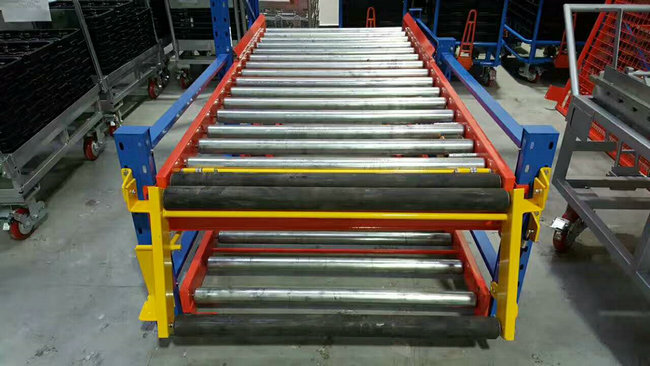 流利式貨架又稱為滾輪式貨架,流利架是將貨物置于滾輪上,利用一邊通道存貨,另一邊通道取貨。料架朝出貨方向向下傾斜,貨物在重力作用下向下滑動(dòng)??蓪?shí)現(xiàn)先進(jìn)先出,并可實(shí)現(xiàn)一次補(bǔ)貨,多次揀貨。流利架存儲(chǔ)效率高,適合大量貨物的短期存放。廣泛應(yīng)用于工廠的生產(chǎn)線和物流配送中心的分揀區(qū)域內(nèi)。